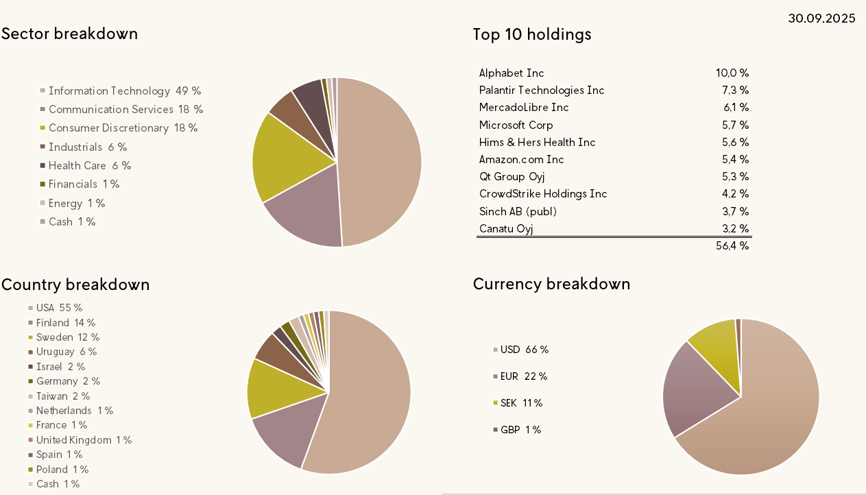 By diversifying, we reduce the risk in a rapidly changing industry. When selecting investments, we put special emphasis on the fact that the company may become a leader in its field. These companies have the prerequisites to achieve a strong market position globally and grow their revenues and earnings rapidly. In addition, the company must be exceptionally innovative and have a management that has been proven competent in their field.