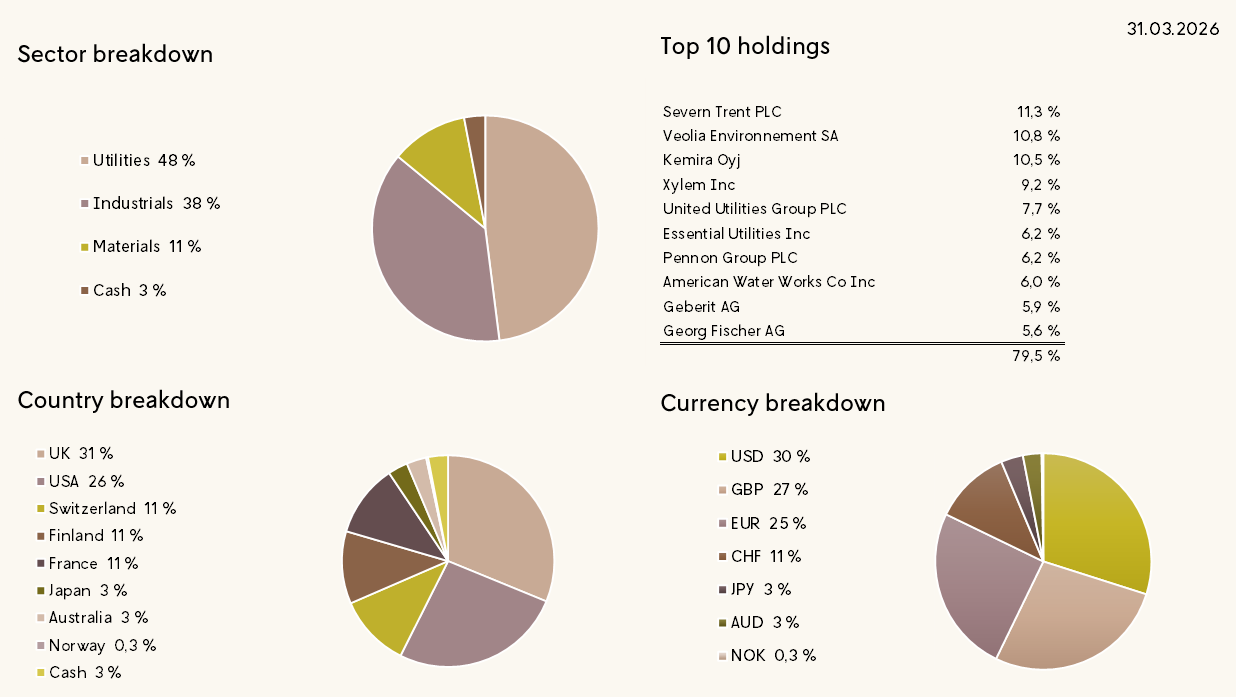 In the selection of companies, emphasis is placed on large and medium-sized, stable, and high-quality companies. In addition, the fund can invest in smaller listed or unlisted Nordic companies. With these investments we aim for a more focused water strategy.