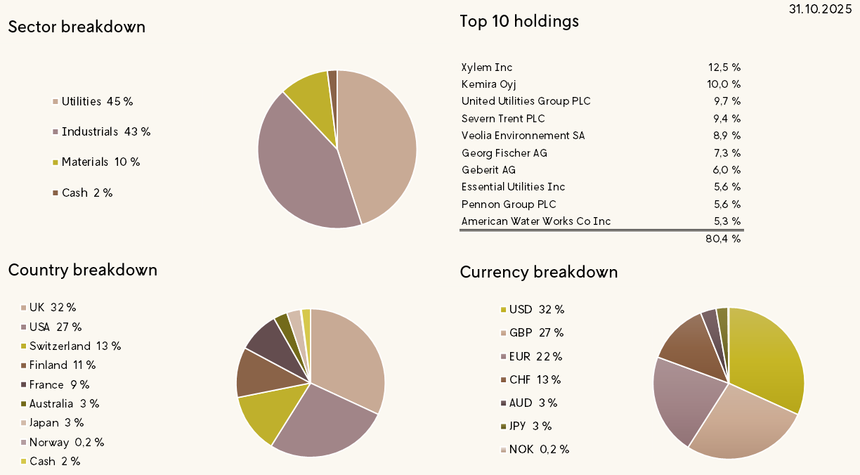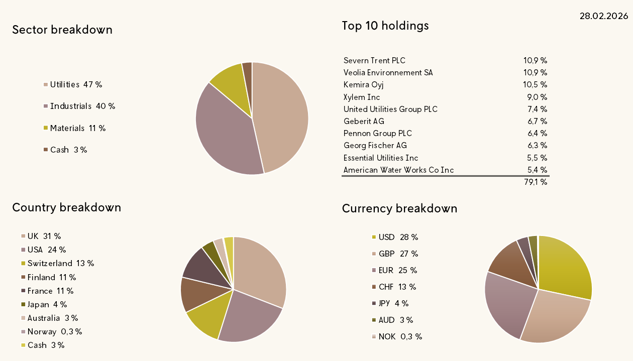 Vesi on elintärkeä, mutta niukka resurssi. Monet tekijät kuten kaupungistuminen, ilmastonmuutos ja väestönkasvu rasittavat olemassa olevia rajallisia vesivarojamme. WIP Water Fund sijoittaa maailmanlaajuisesti vesitoimialan yhtiöihin, jotka edistävät tehokkaampaa vedenkäyttöä. Yhtiöiden pääasiallinen liiketoiminta pohjautuu veteen liittyviin toimintoihin, kuten vesi-infrastruktuuriin tai vesiteknologiaan, painottaen kestävän kehityksen periaatteita noudattavia yhtiöitä.